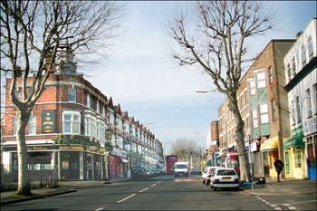 Hornsey High Street today, with the 'Three Compasses' pub on the left. |