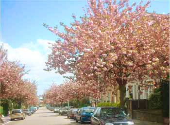 Cecile Park in Spring is Crouch End's prettiest street with its spectacular flowering cherry trees. After the bloom a carpet of petals cover the ground like pink snow, cheering the commuters on their dreary way to work. The street celebrated its centenary in 1988. |